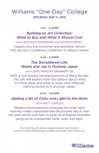 “We had wonderful time at a College in One Day program on Saturday afternoon, May 11. The program featured 3 one-hour presentations by 4 fabulous Williams professors covering a course on purchasing art for the Williams College Museum of Art, the decluttered life in postwar Japan, studying brain activity by using using light to stimulate specific cells.